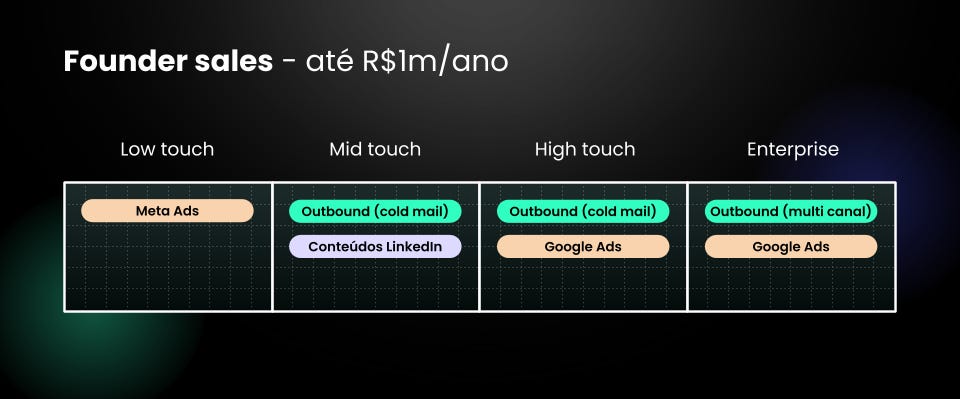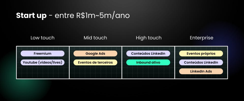 Low touch: recomendo Meta Ads - para a surpresa de muitos -, pois é um canal que possibilita fazer testes com escala a um custo relativamente baixo. Algo que é bem adequado no estágio que a empresa ainda precisa validar pitch, oferta, preço, ICP etc.