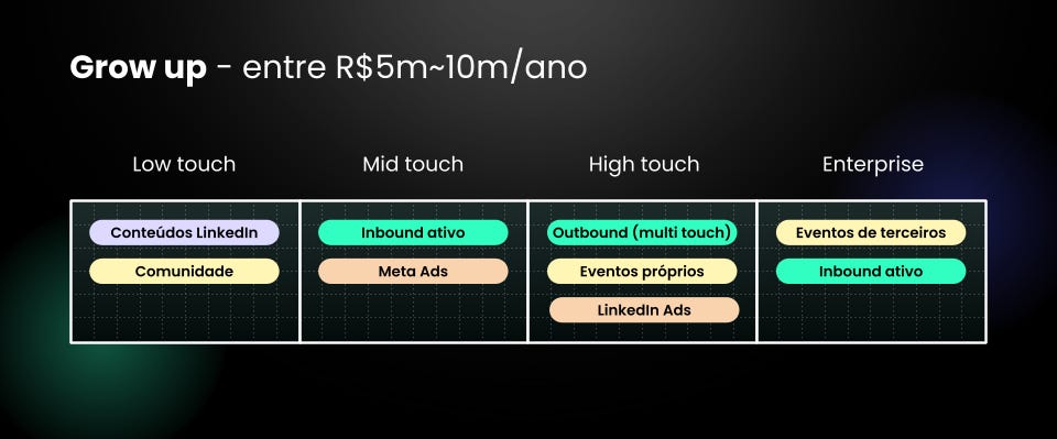 Low touch: faz sentido começar a olhar para além da captura e conversão de demanda, mas também para o desenvolvimento de mercado. Neste caso, faz sentido produzir para conteúdos de LinkedIn - uma estratégia “build in public” pode vir a calhar - além de começar a engajar usuários em comunidade, que é uma forma de escalar relacionamento e estimular user-generated content.
