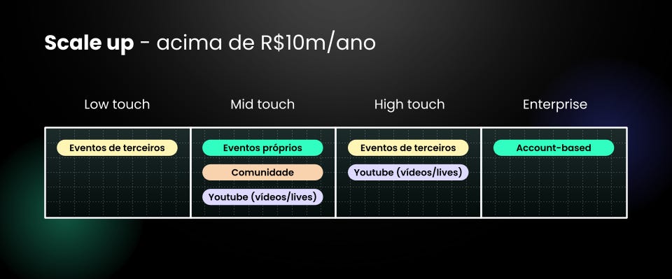 Mid touch: aqui entra o tripé que temos trabalhado na Ramper nesses últimos tempos. Construção de comunidade dentro do nosso nicho, canais proprietários (Youtube, newsletter) e também construir eventos próprios - no nosso caso, o Ramp Up Tour. Empresas no modelo mid touch normalmente operam em mercados muito competitivos e vão precisar educá-los se quiserem liderar suas categorias.