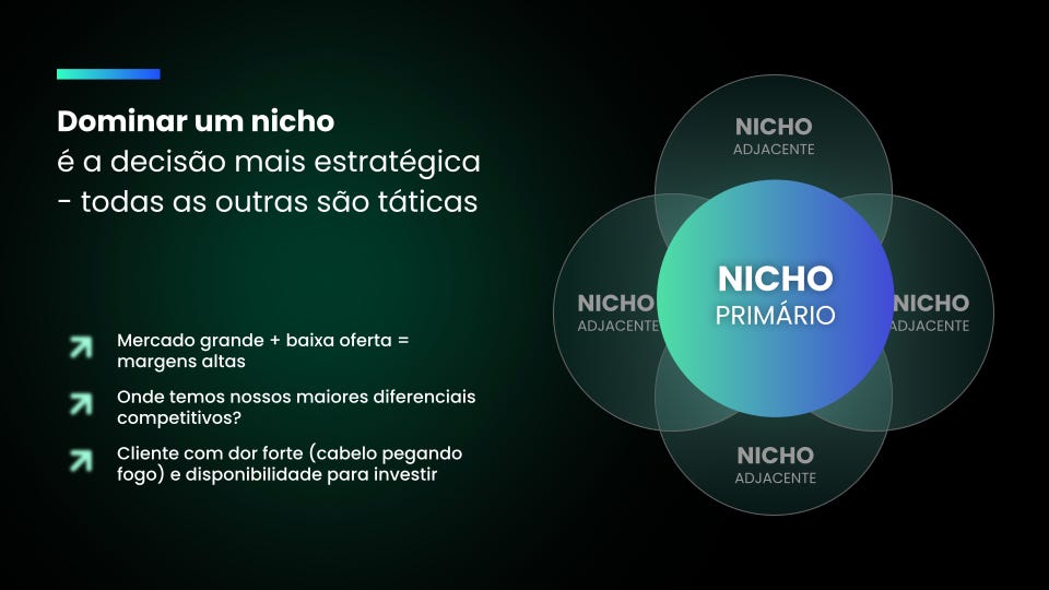 Além disso, focar nicho alinha a espinha dorsal da estratégia de go-to-market. Possibilita trazer os ICPS certos - mais margem e rentabilidade - e focar nos canais certos - mais oportunidades e menos desperdício.