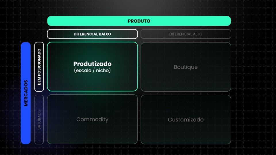 Cada posicionamento carrega implicações econômicas distintas em termos de margem, volume, complexidade de venda e expectativa do cliente.