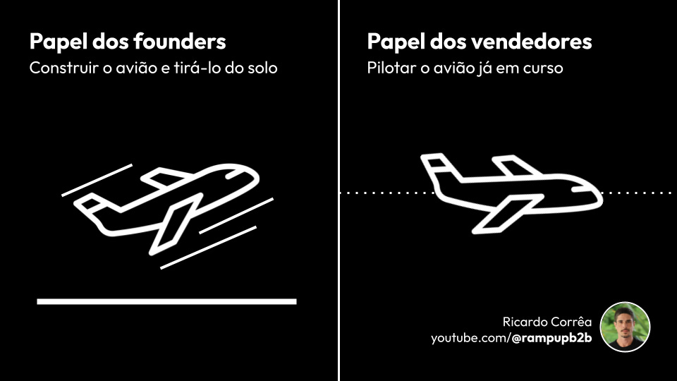 Uma metáfora que eu gosto de usar é que existe quem constrói o avião e quem pilota o avião. O vendedor é alguém que vai pilotar um avião que já está em curso, mas quem tem que construir o avião e colocá-lo no ar é o founder.