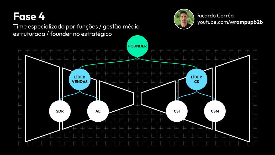 Estágio 4 (estratégico): foi somente neste estágio, já com cada área tendo sua própria liderança - marketing, vendas e CS - foi que eu consegui “subir para o estratégico” e me tornar CEO de fato.
