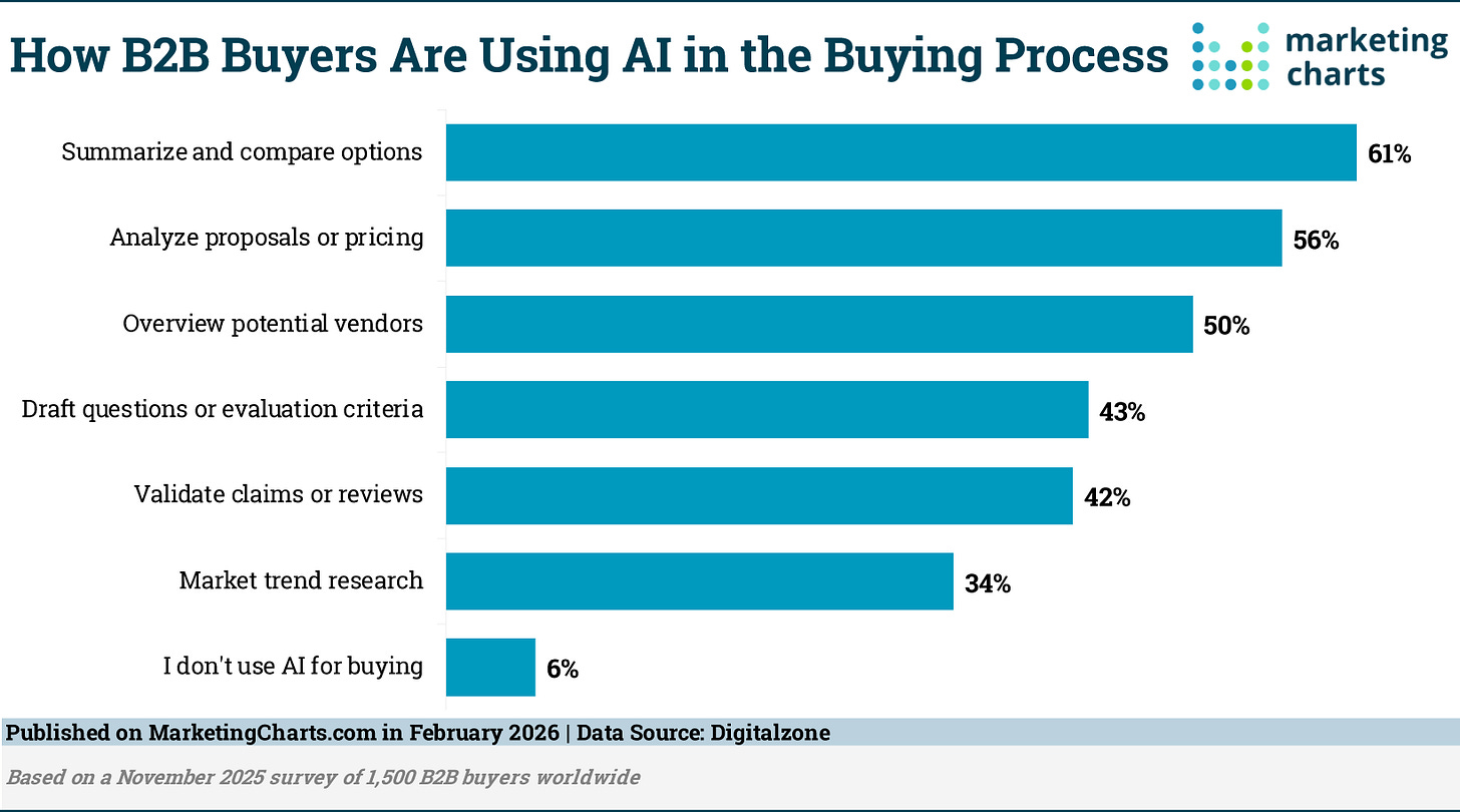 Na prática, isso desloca uma parte relevante da jornada que antes acontecia através da interação entre cliente<>fornecedor B2B para um novo espaço: a progressão mais autônoma por parte do cliente, que agora usa IA. Se antes o decisor buscava informações e rapidamente “levantava a mão” no site do fornecedor, agora ele percorre uma parte significativa da jornada sem interagir com empresas.