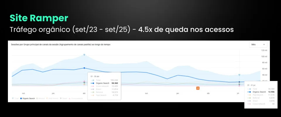 Contudo, o tráfego orgânico dos sites caiu na ordem de 4-5x em um intervalo de 2 anos - e aqui na Ramper, não foi diferente. Eu mesmo já mostrei essa queda publicamente, e foi um dos fatores que me levaram a repensar a estratégia.