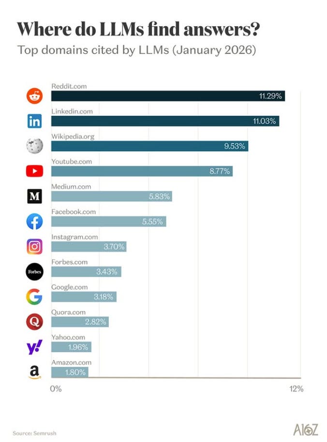 Fontes das LLMs: SemRush (imagem extraída do Instagram da a56z)