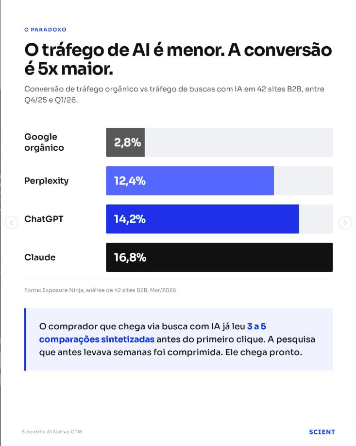 Um fato interessante é que, embora o volume de tráfego gerado pelas IAs ainda seja menor do que o do Google, a taxa de conversão tende a ser significativamente maior. Isso acontece justamente porque o lead chega mais preparado.