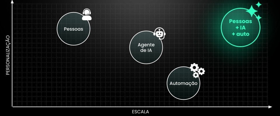 Para a maioria das empresas B2B, a jornada não é substituir pessoas, mas combinar Pessoas + Inteligência Artificial + Automação. É essa orquestração que permite conciliar personalização e escala.