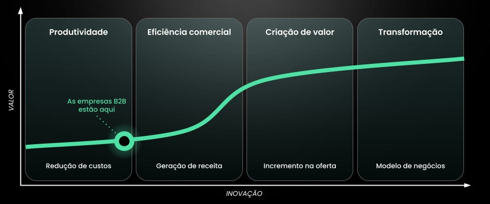 Estamos no pico do hype, mas a maioria das empresas B2B ainda está no início do arco de evolução da IA - nos estágios “+IA” - onde o uso se resume ao ChatGPT e similares para ganhos de produtividade e redução de custos.