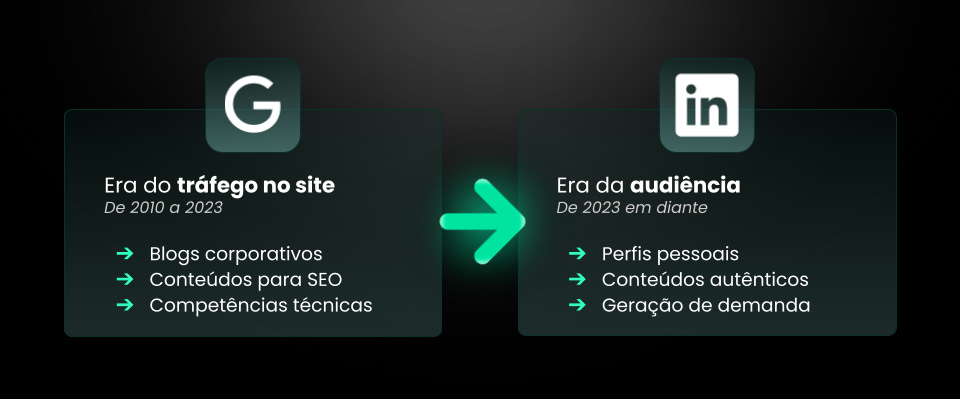 Saímos da era do tráfego e entramos na era da audiência, onde conteúdo autêntico - muitas vezes produzido por fundadores e lideranças - é o que gera tração.