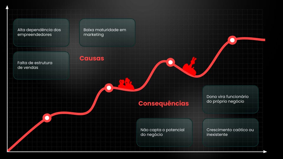 Falta de estrutura comercial: os negócios dependem do proprietário ou de um ou dois vendedores, operando sem processo de vendas, pipeline, cadências claras, onboarding e acompanhamento de performance.
